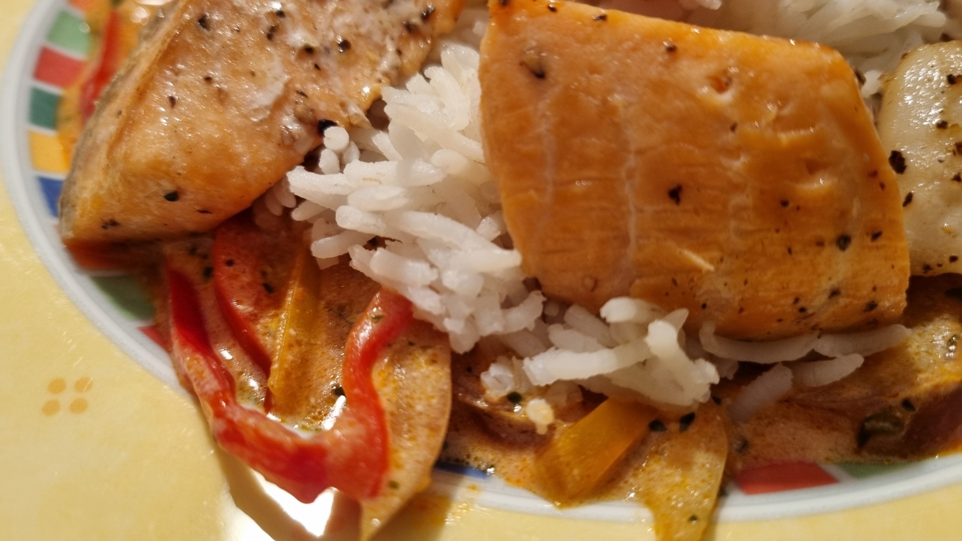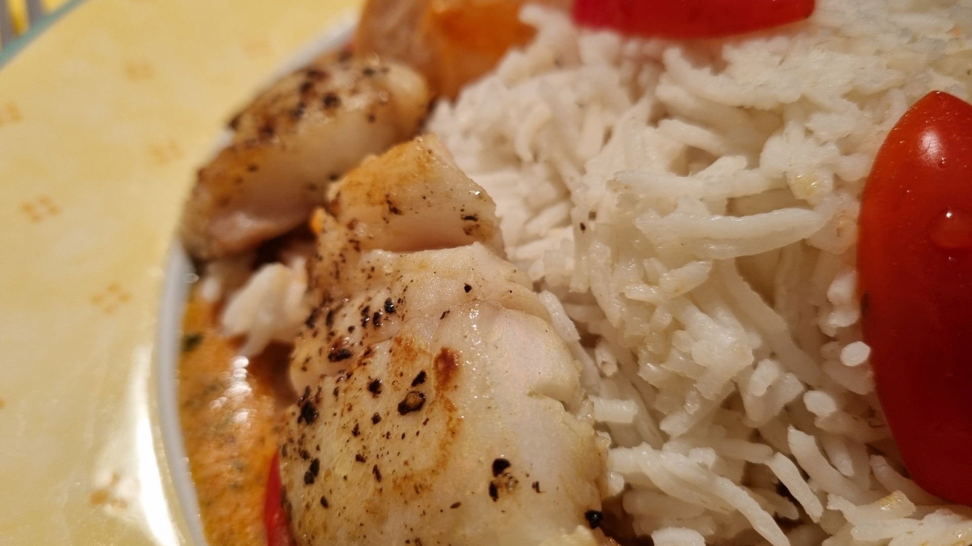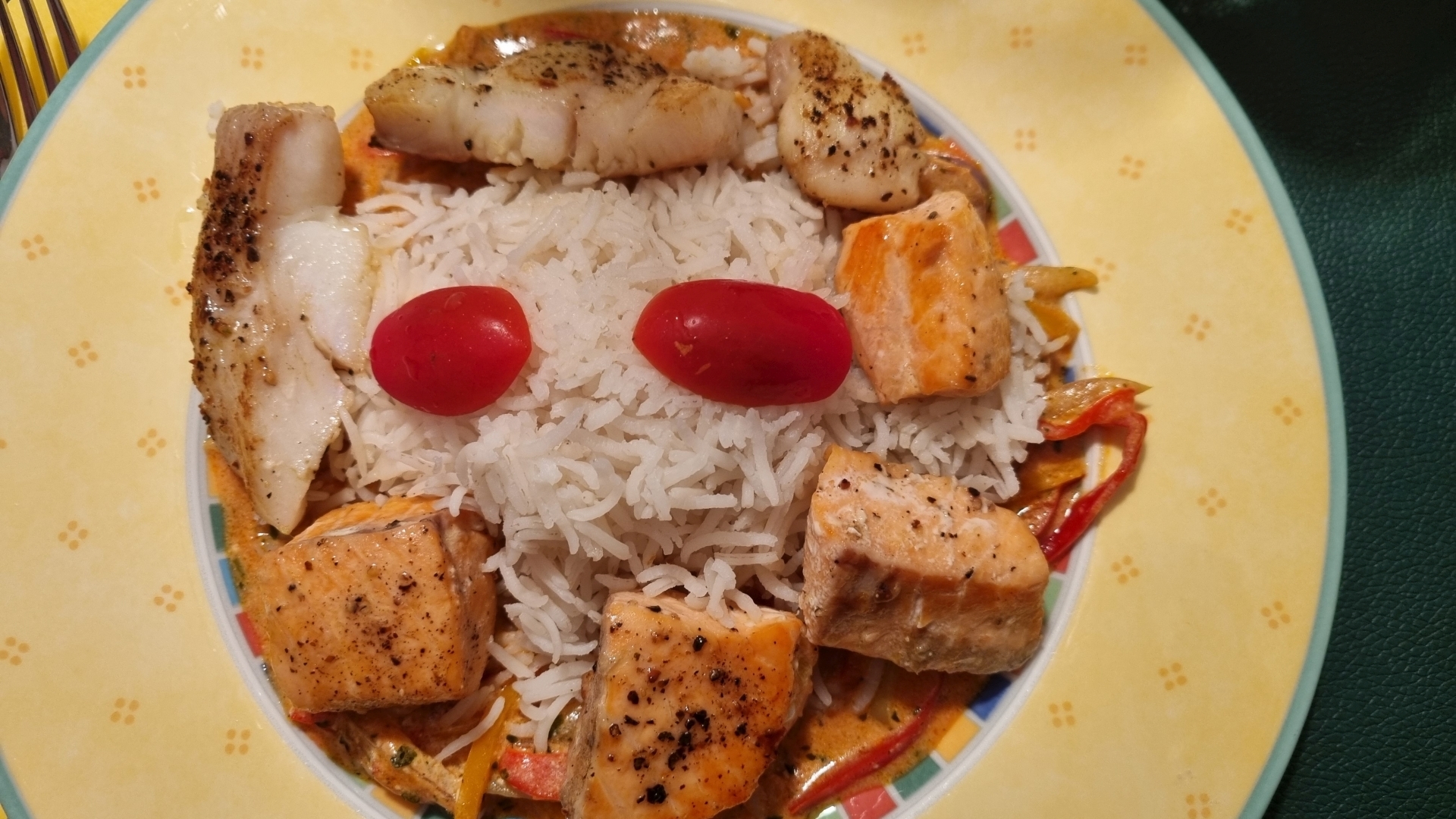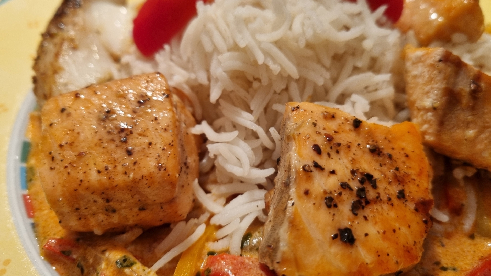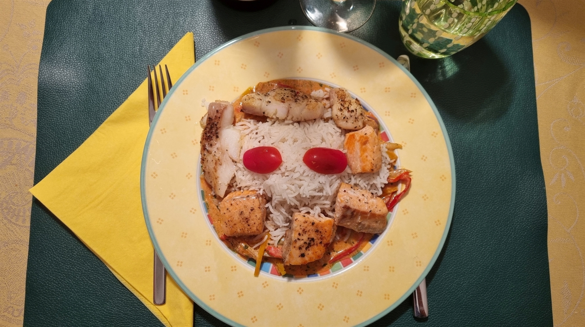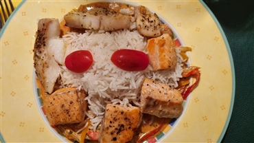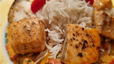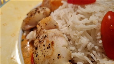 Crème fraîche verrühren, ebenfalls einrühren und einmal aufkochen. Zum Schluss die Fischstücke darin kurz erhitzen. Fischpfanne dem Basmatireis servieren.