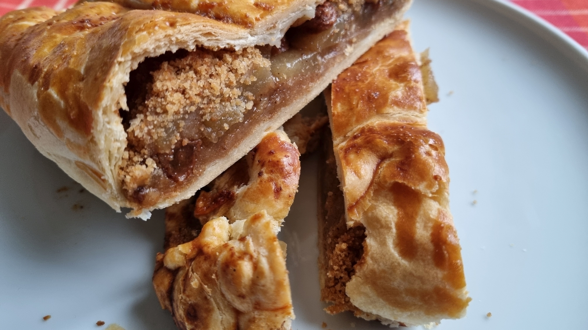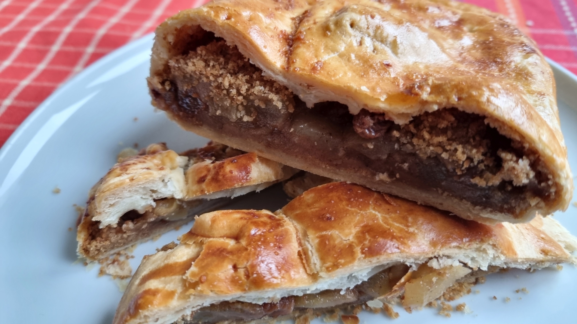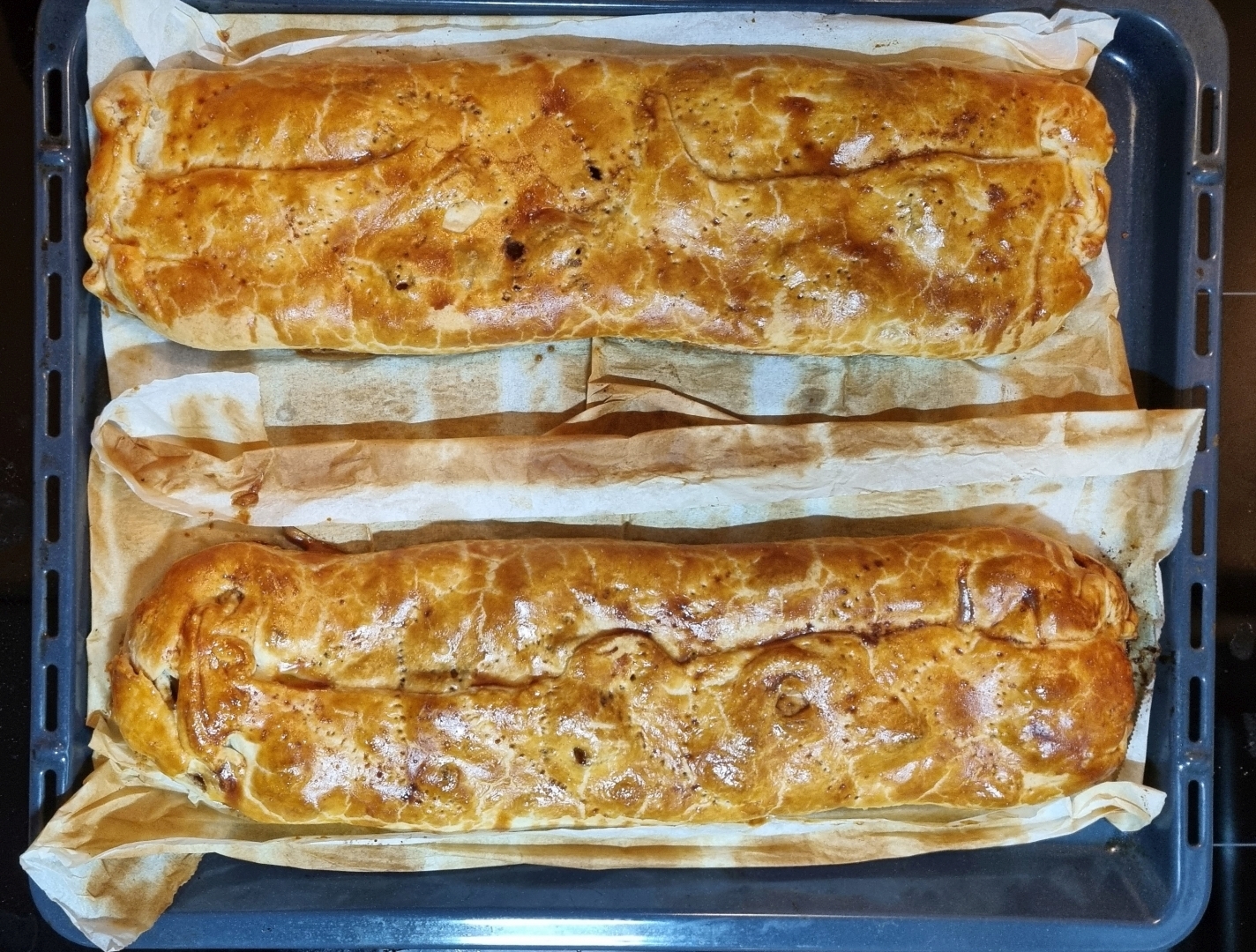 Teigränder mit verquirltem Ei bestreichen und den Teig von unten einschlagen. Die Seiten etwas festdrücken und den Strudel mit einer Gabel mehrmals einstechen. Nochmals mit verquirltem Ei bestreichen.