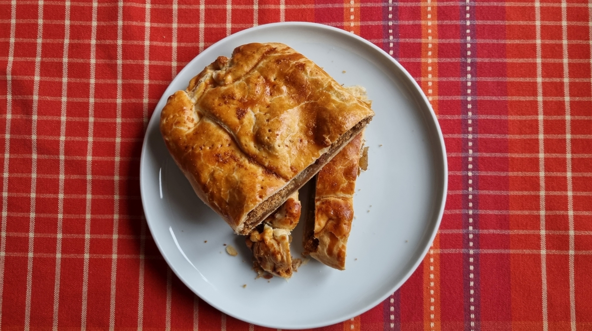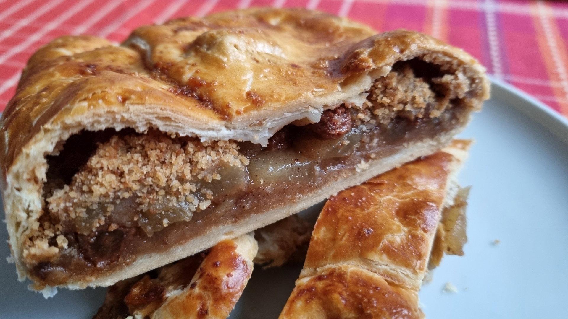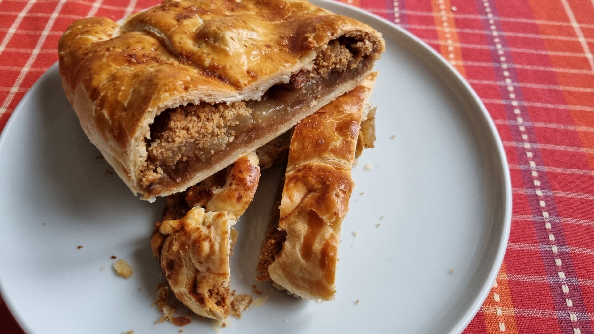 Teigränder mit verquirltem Ei bestreichen und den Teig von unten einschlagen. Die Seiten etwas festdrücken und den Strudel mit einer Gabel mehrmals einstechen. Nochmals mit verquirltem Ei bestreichen.