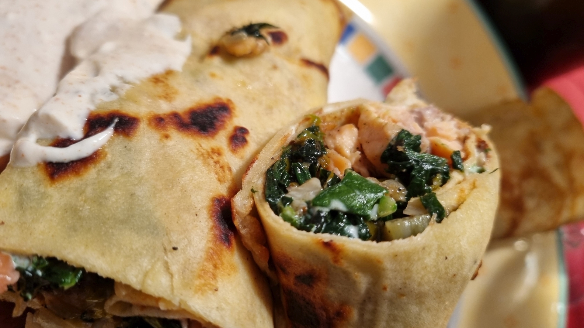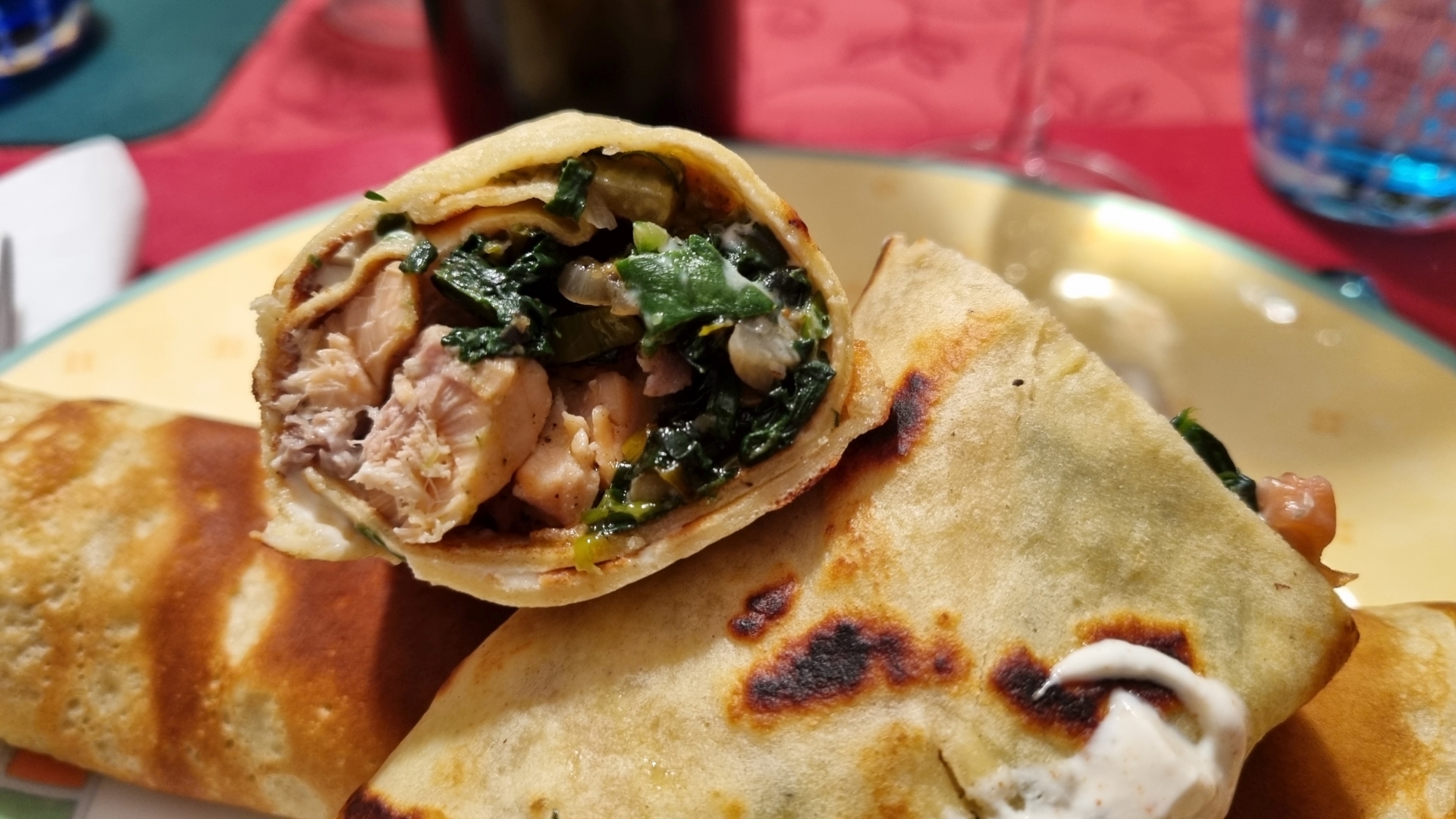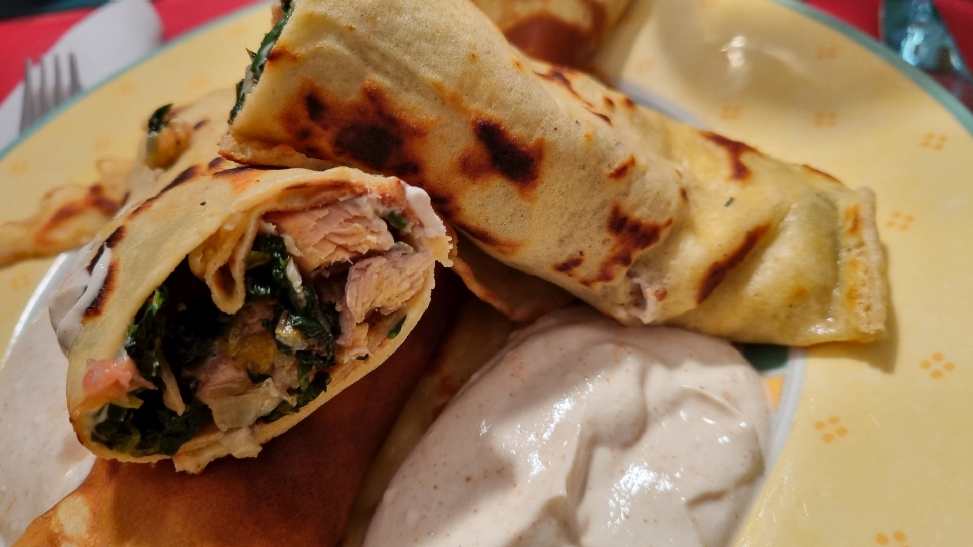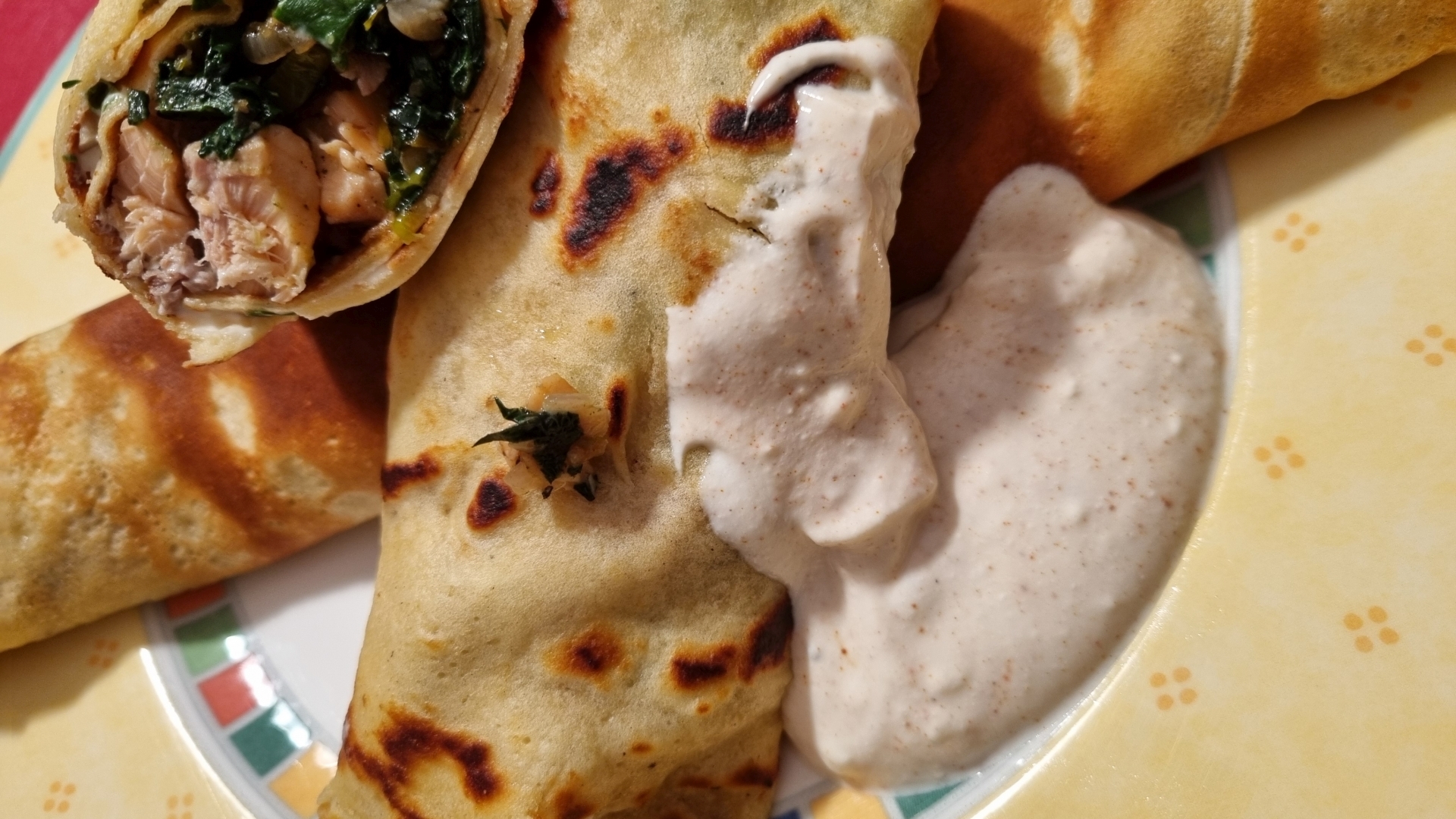 Jede Palatschinke mit Cremefraiche ausstreichen, mit etwas Spinat belegen, Fischwürfel drauf verteilen und Palatschinke zusammenrollen. Auf vorgewärmten Tellern anrichten und mit Joghurt-Sauerrahm-Dip servieren.