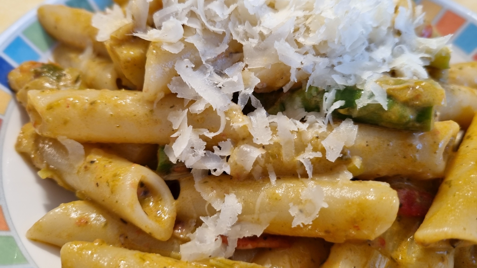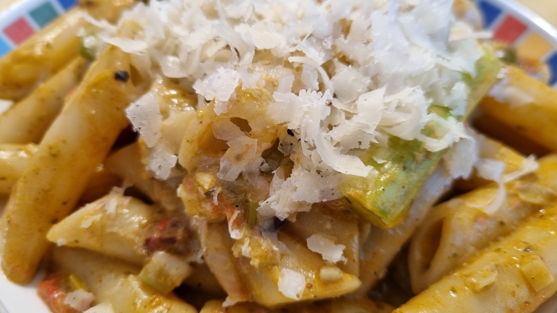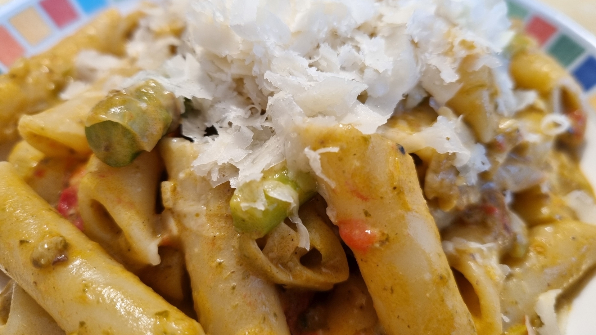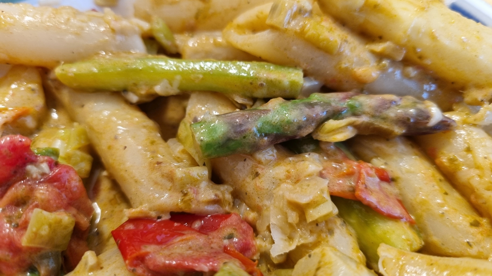 Spargel schälen, in Stücke schneiden und im Dampfgarer bissfest garen. Zwei Blätter Stangensellerie klein schneiden, ebenso die Zwiebel schneiden und alles kurz anrösten, die Paradeiser dazugeben, Spargel ebenfalls mit rösten. Die Pasta nach Anleitung kochen. Das Spargel-Gemisch mit etwas Nudelwasser aufgießen, Pesto und Creme fraiche dazugeben, mit der Pasta zusammengeben. Bei Bedarf mit Pfeffer und Steirererde würzen. Zum Schluss Basilikum und Parmesan darüber geben.