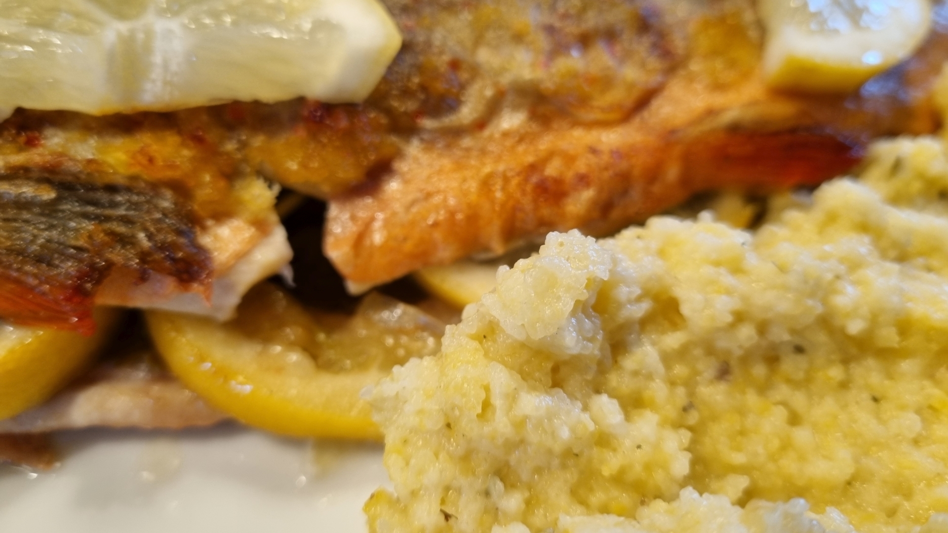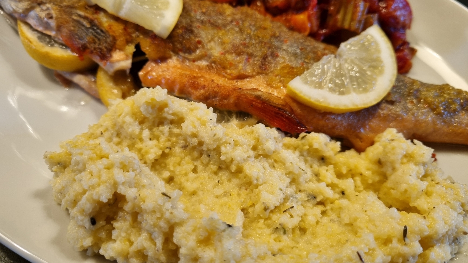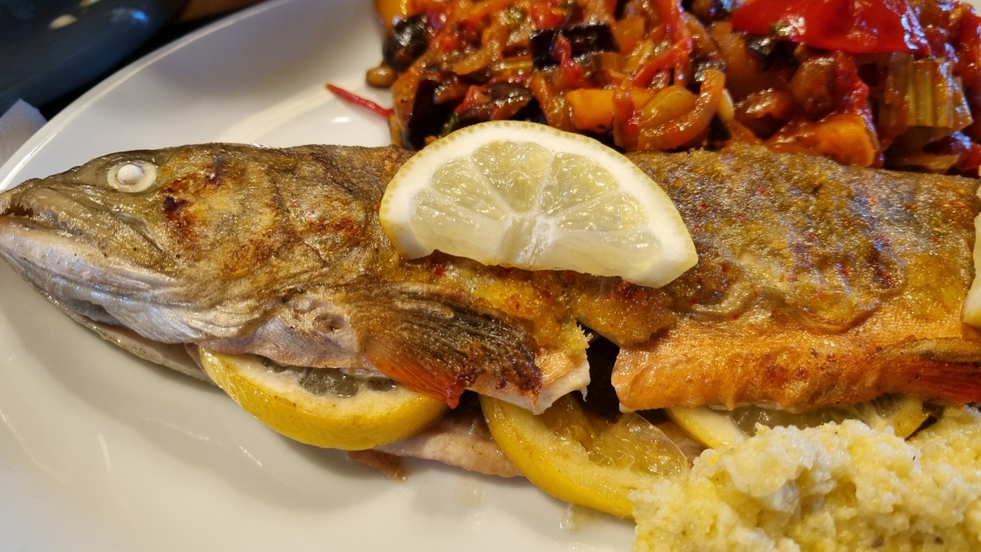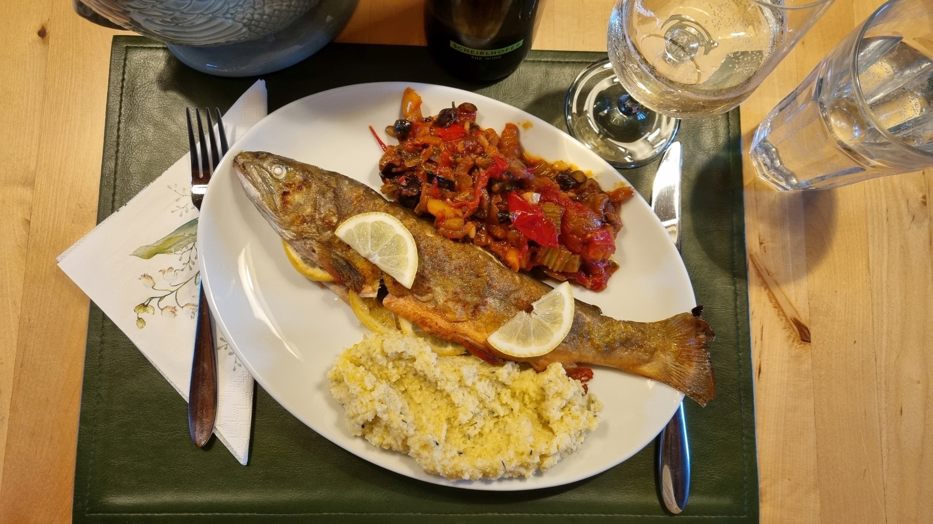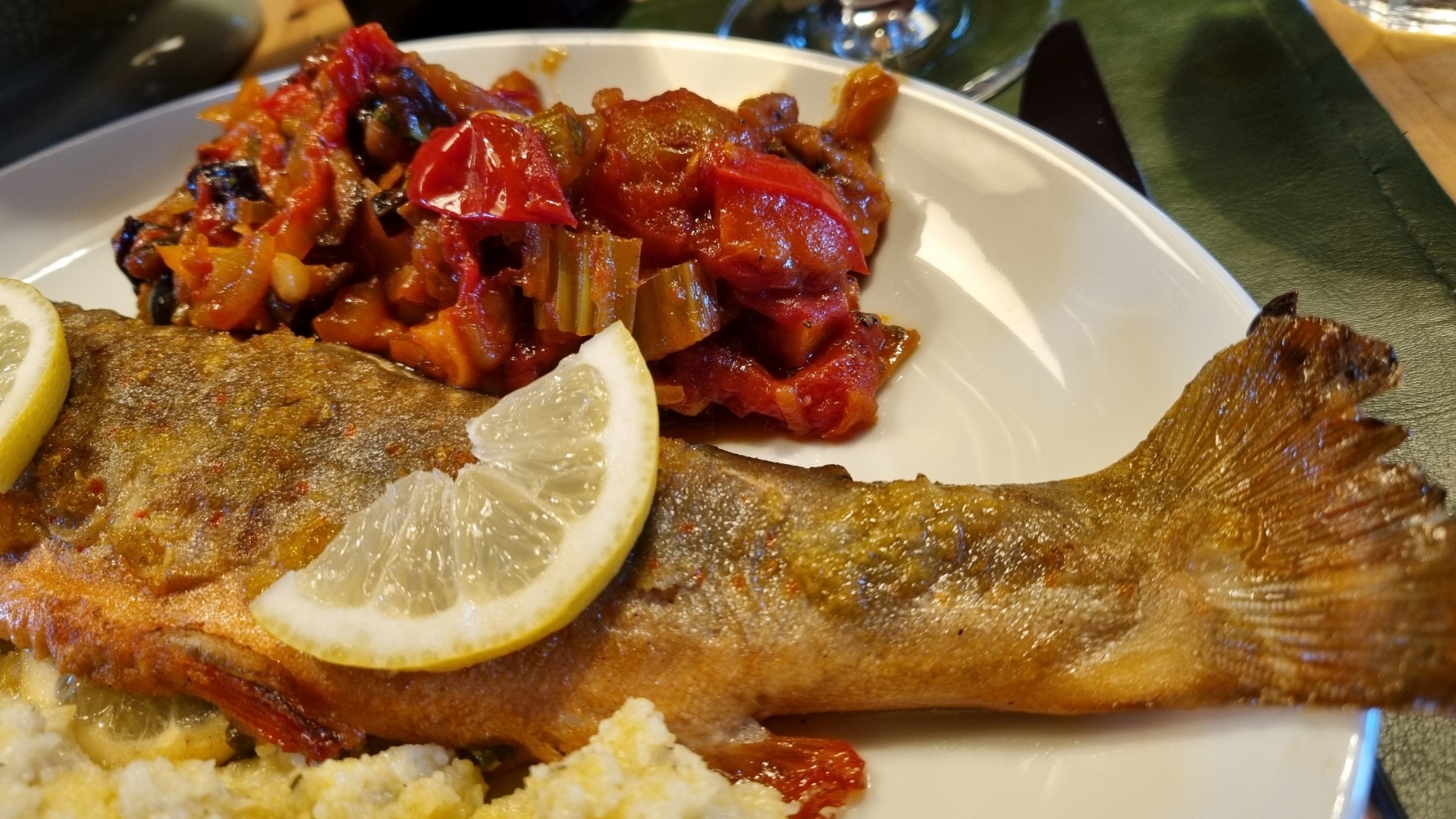 Saibling gebraten mit Polenta und sizilianischer Caponata