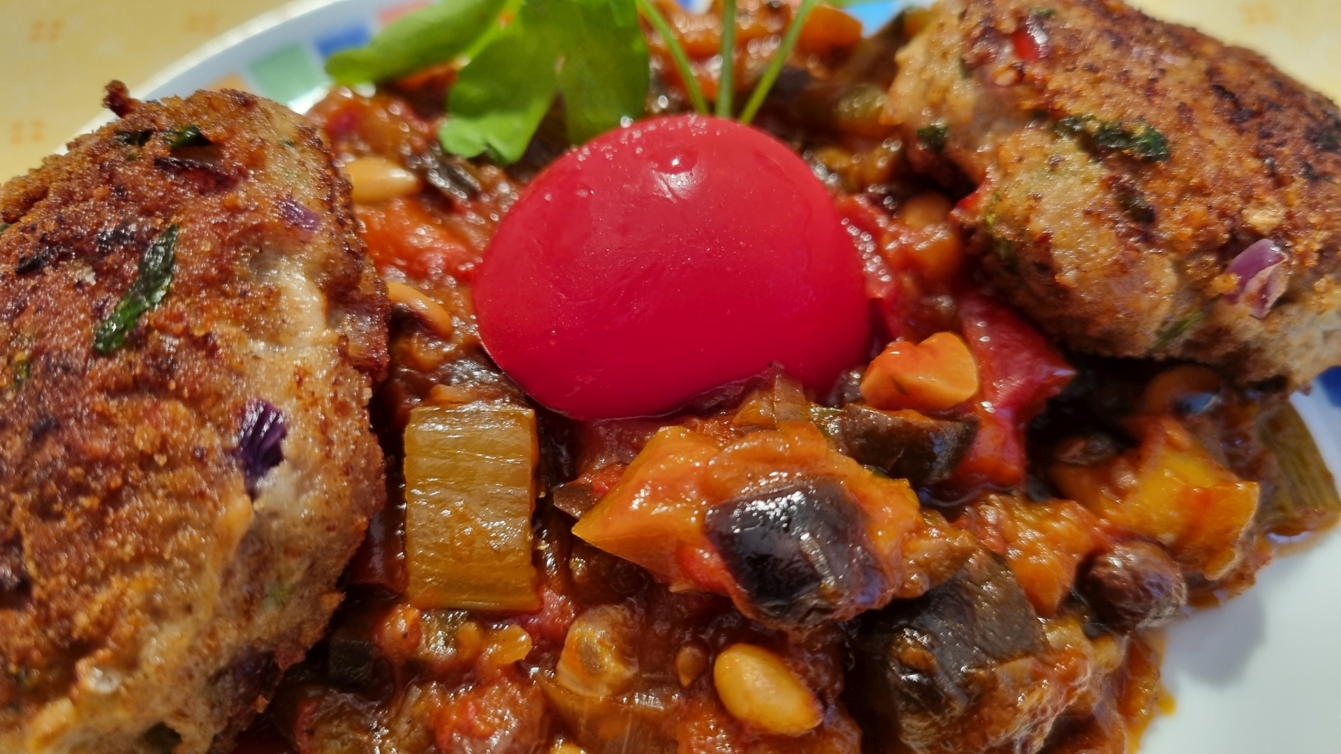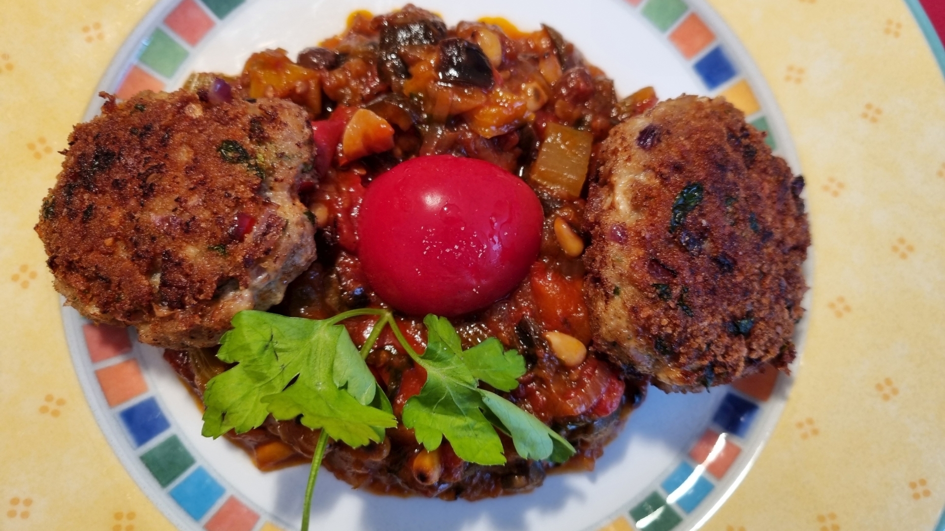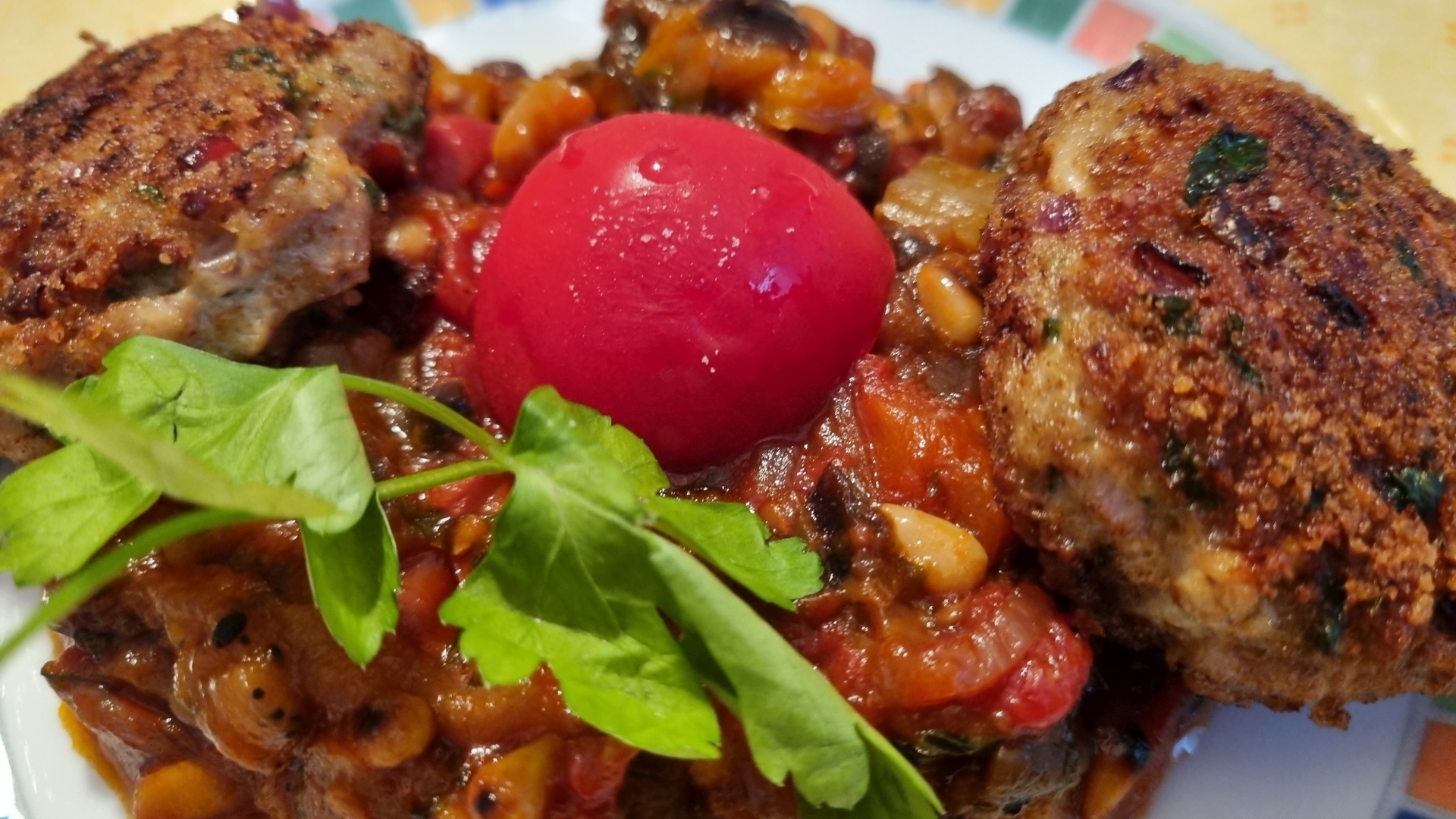 Die Polpette wurden mit einer Caponata (Resteverwertung) serviert