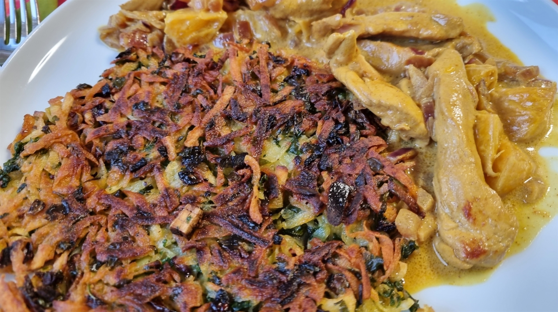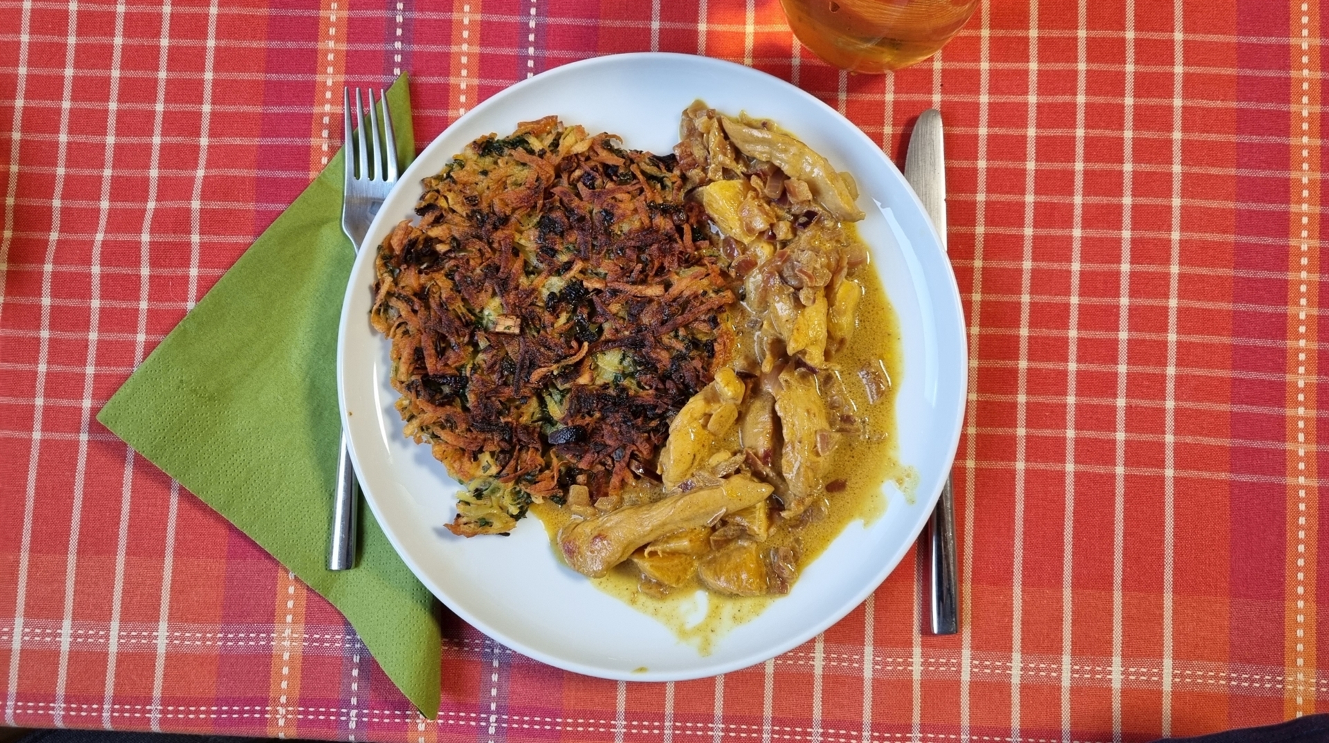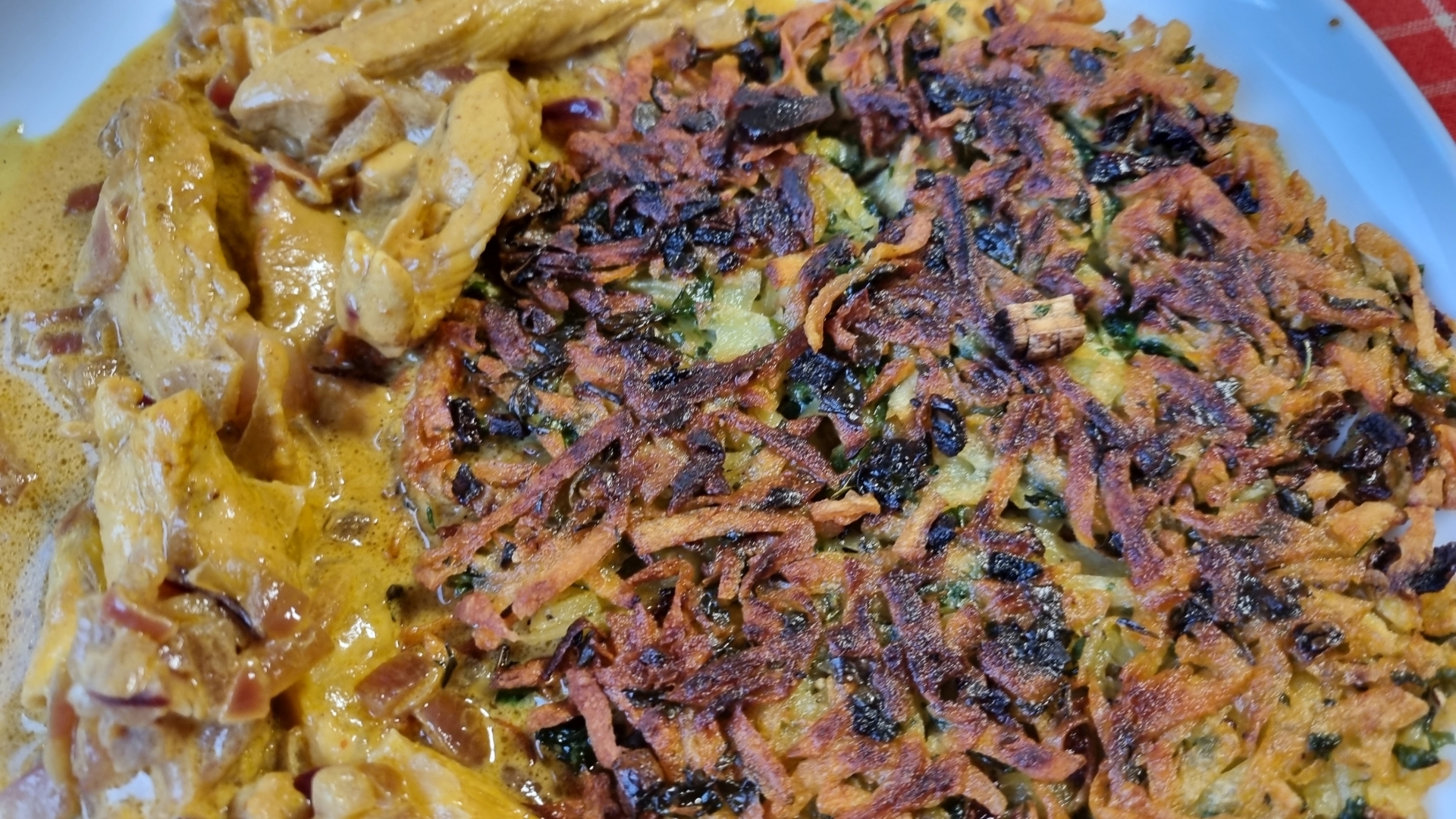 In der Pfanne Pfanne 1 EL Butterschmalz erhitzen, die Hälfte der Rösti-Masse hineingeben und gleichmäßig verteilen. Für ca. 3-4 Minuten braten lassen, ohne zu wenden. Rösti in einer Pfanne braten, anschließend wenden. Die Rösti sollen goldbraun und kross sein. Die andere Seite ebenfalls 3-4 Minuten anbraten.