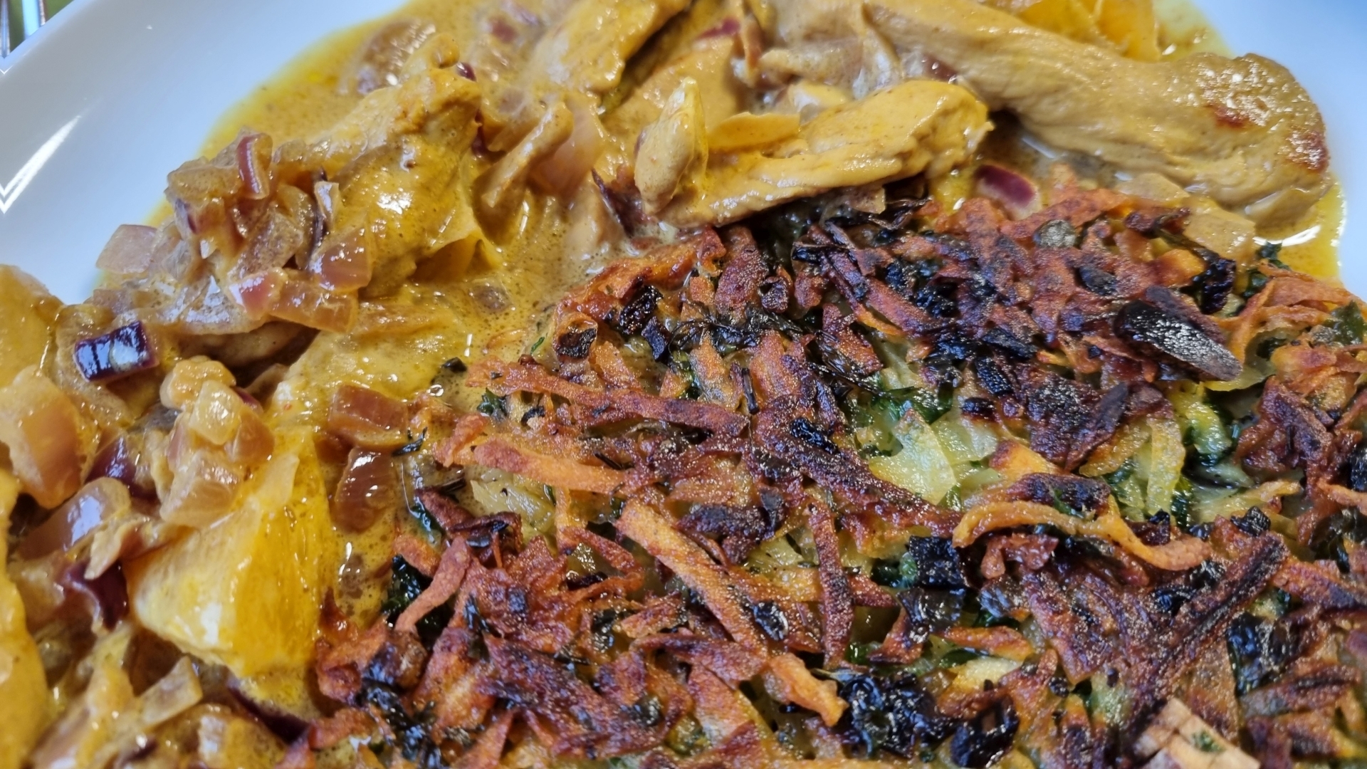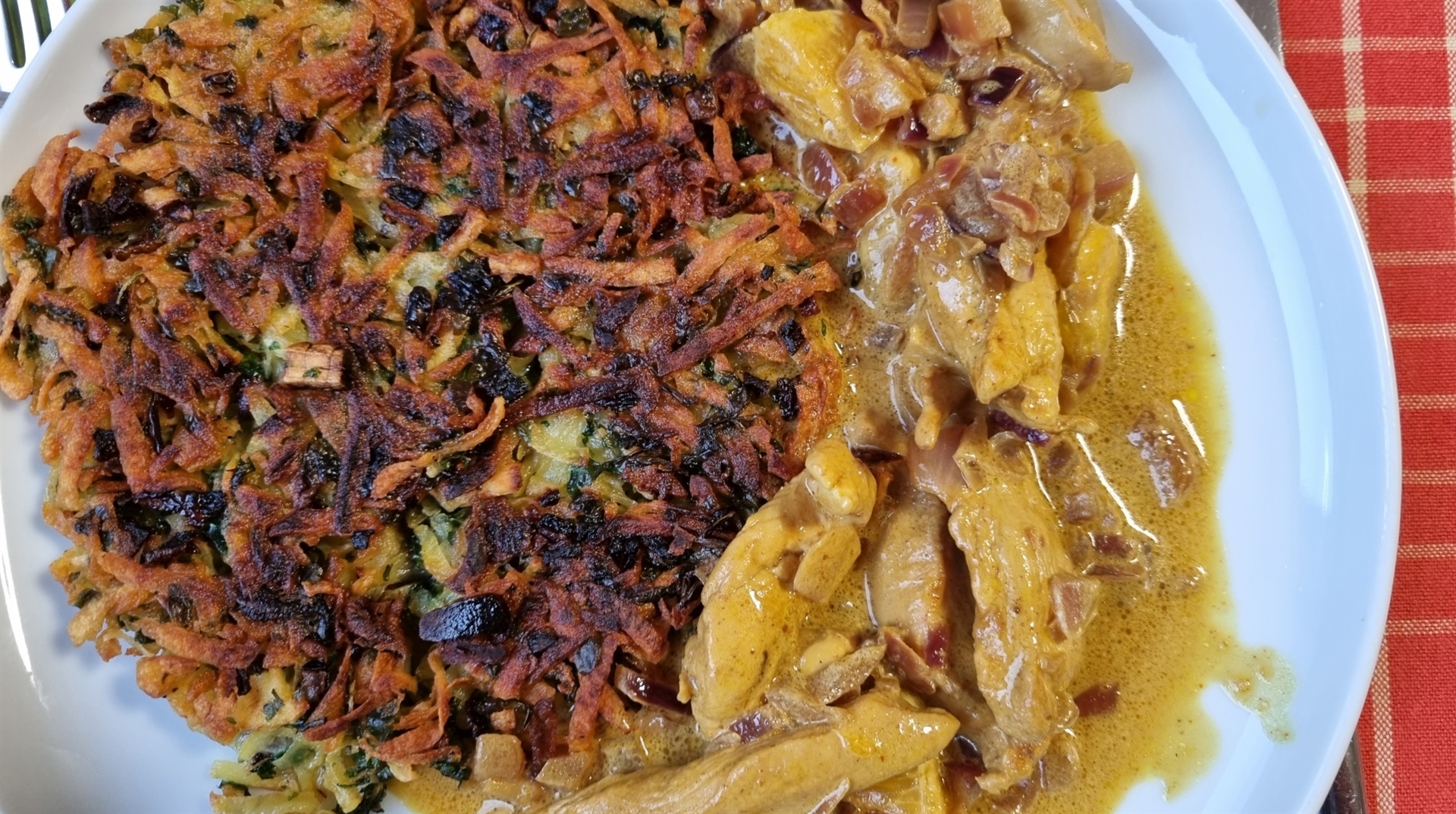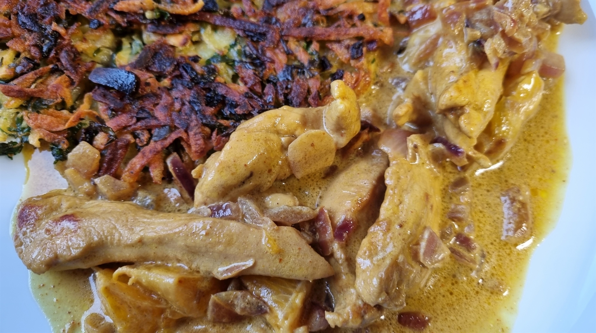 Die Zwiebeln schälen und klein würfelig schneiden. Das Hühnerfilet waschen, trocknen und in Streifen schneiden. Danach Öl in der Pfanne erhitzen, das Fleisch kurz anbraten, mit Curry und Zwiebeln anschwitzen und mit wenig Wasser ablöschen.