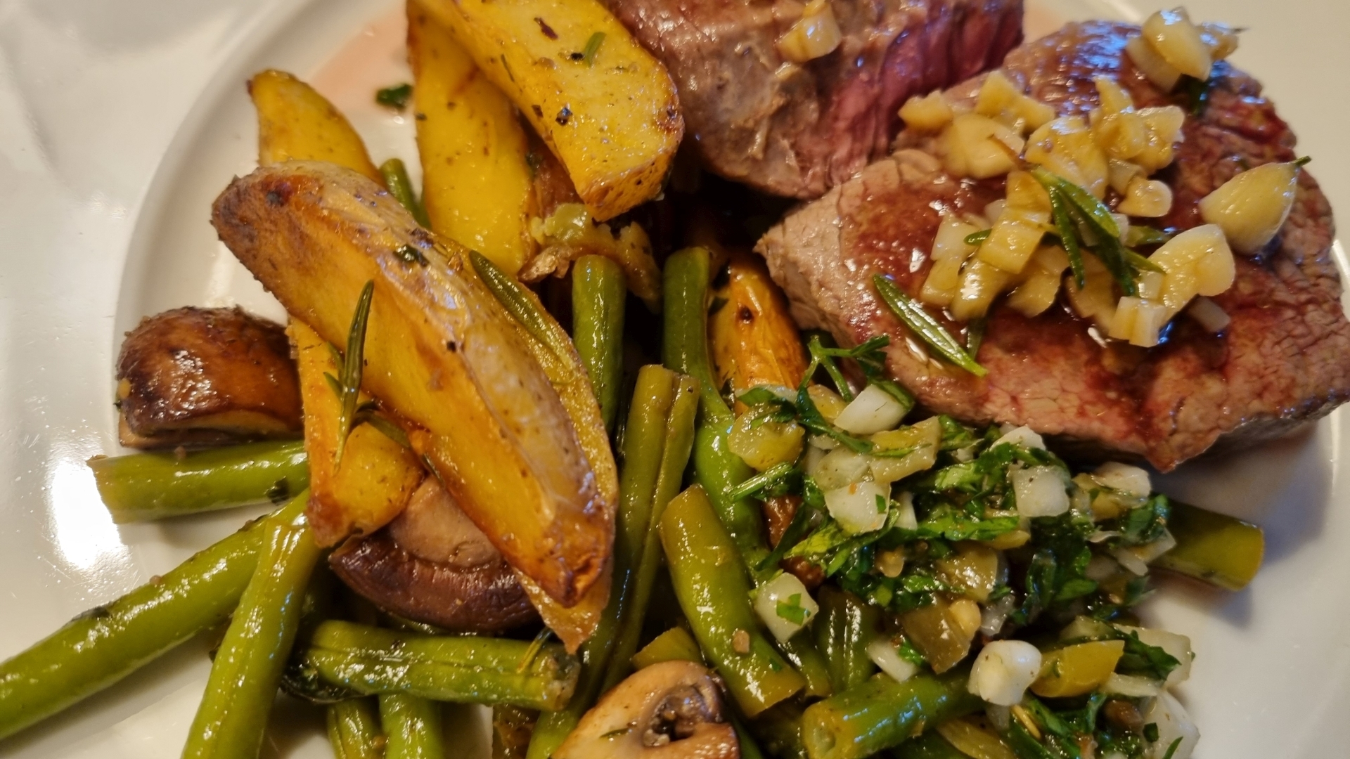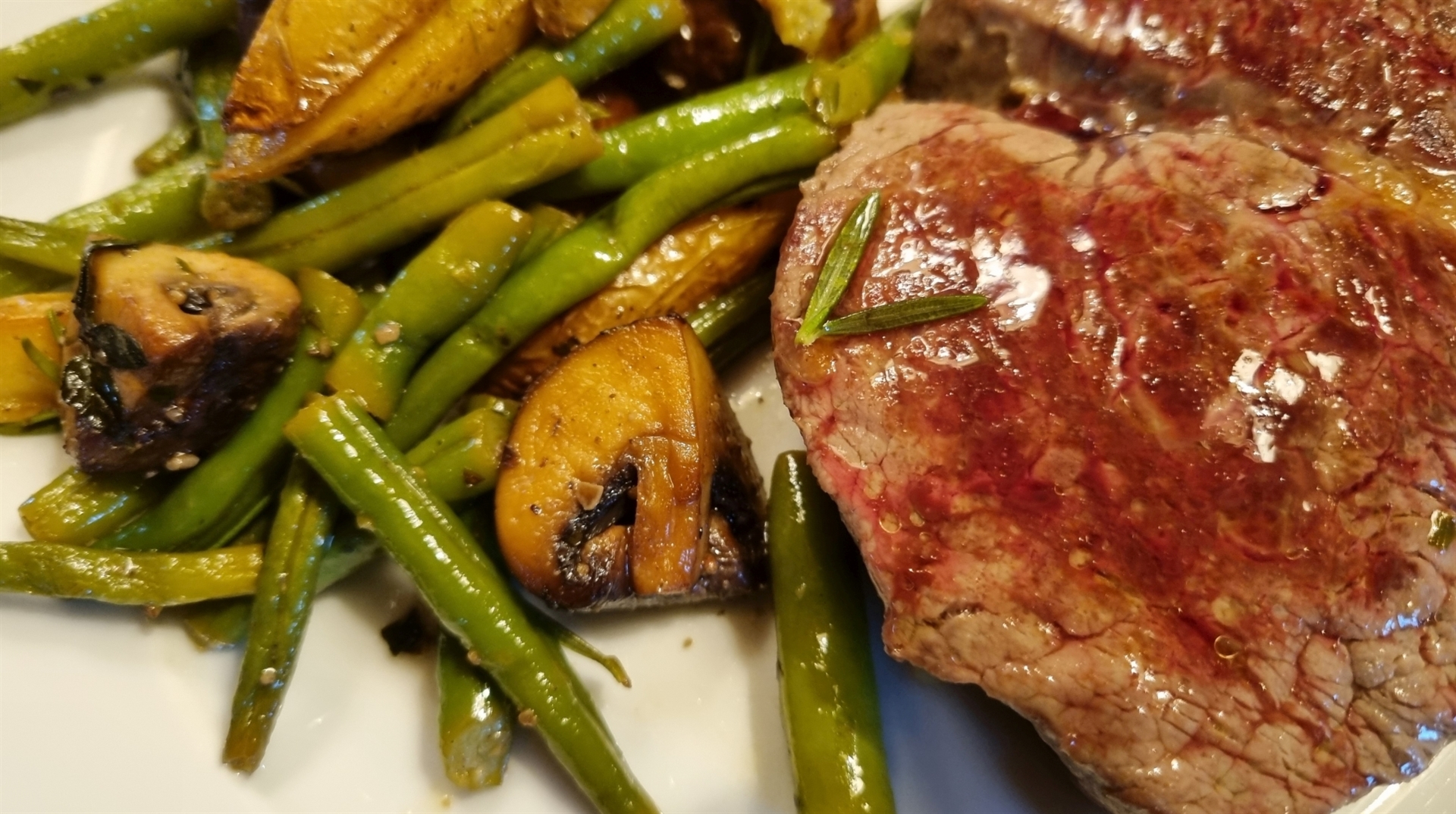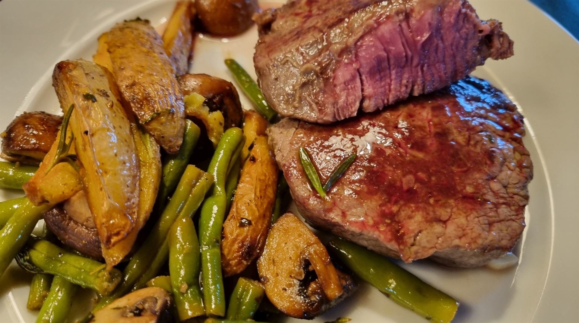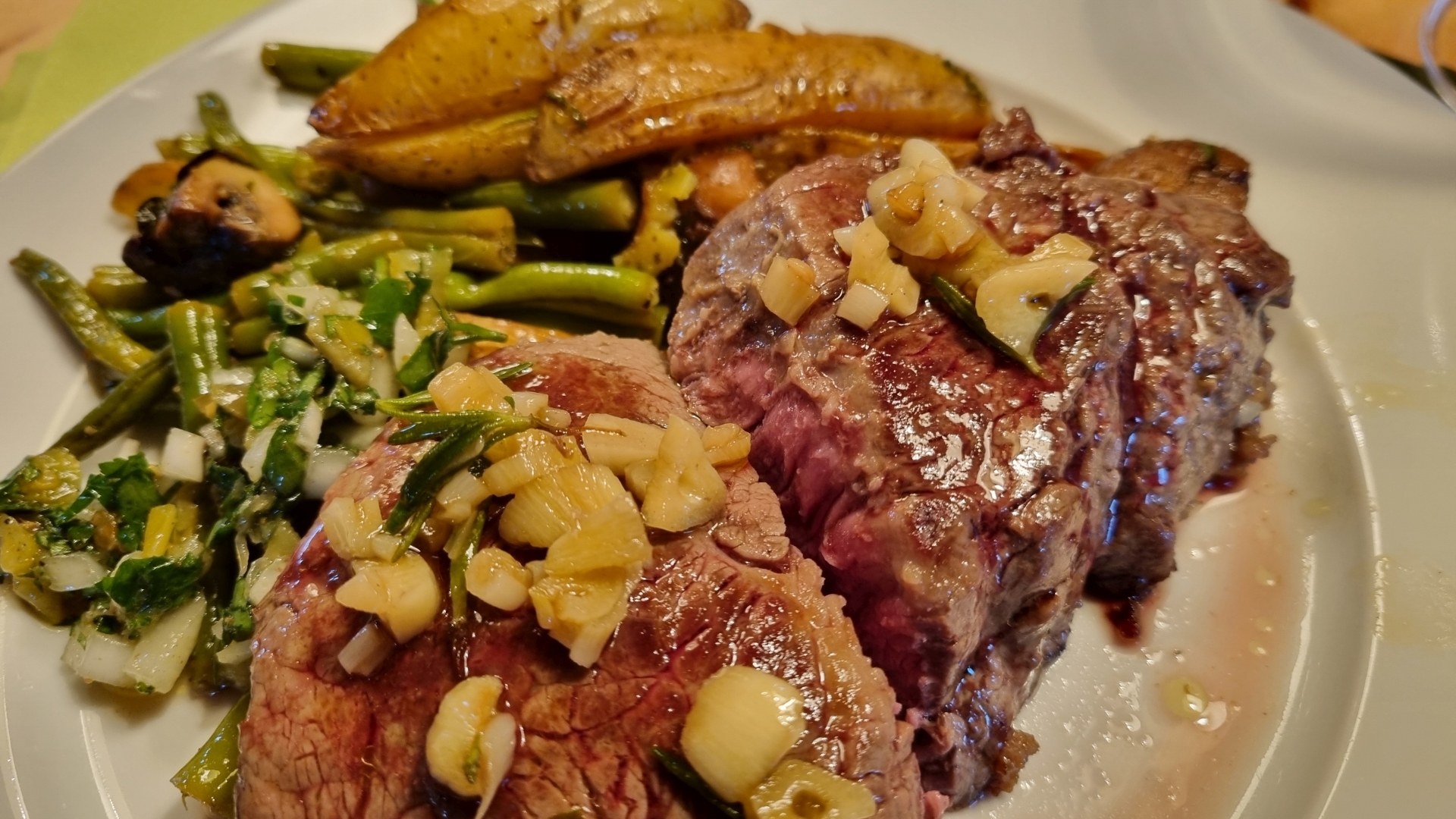 Rindslungenbraten mit Erdäpfel-Fisolen-Pilzen