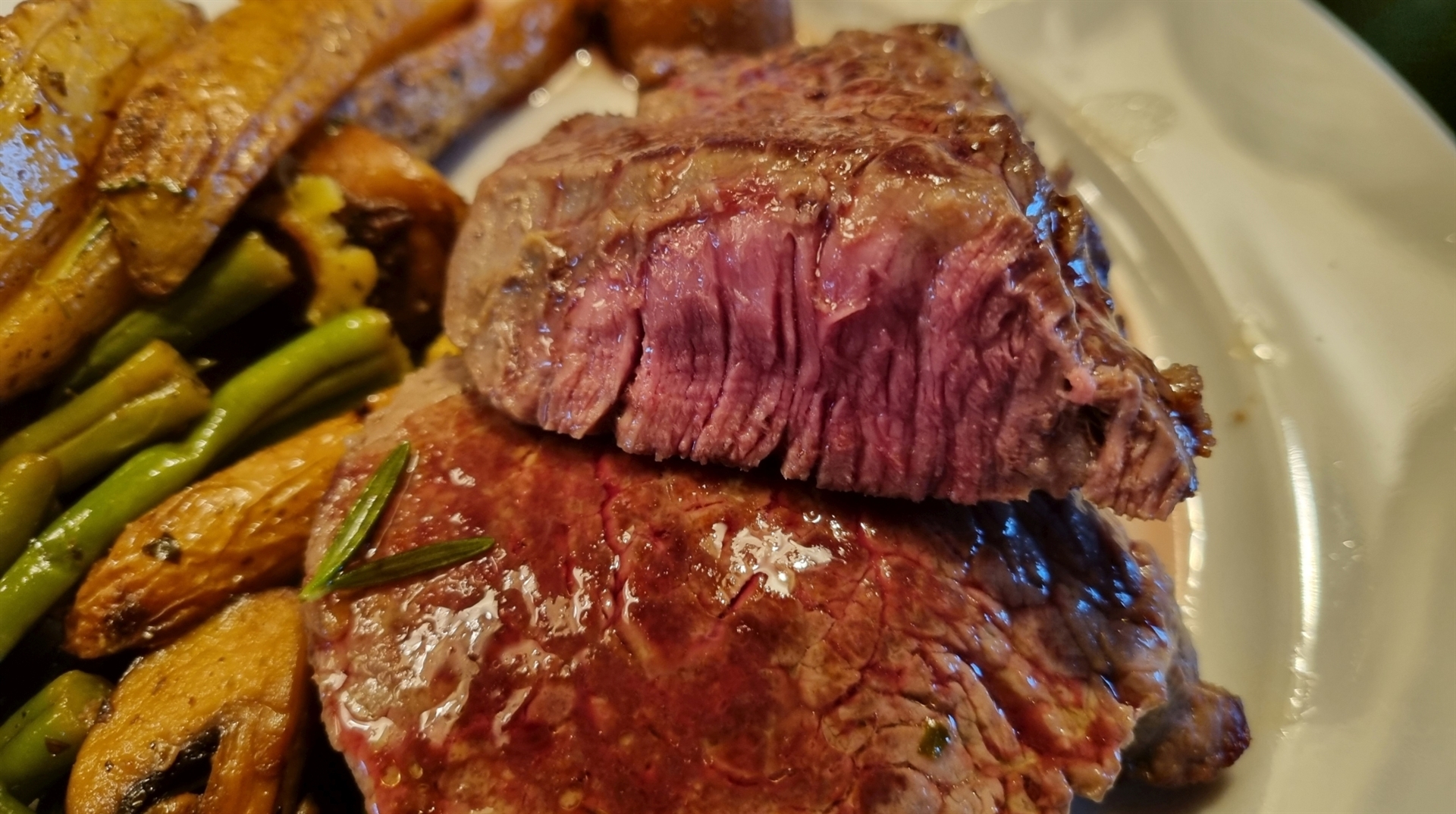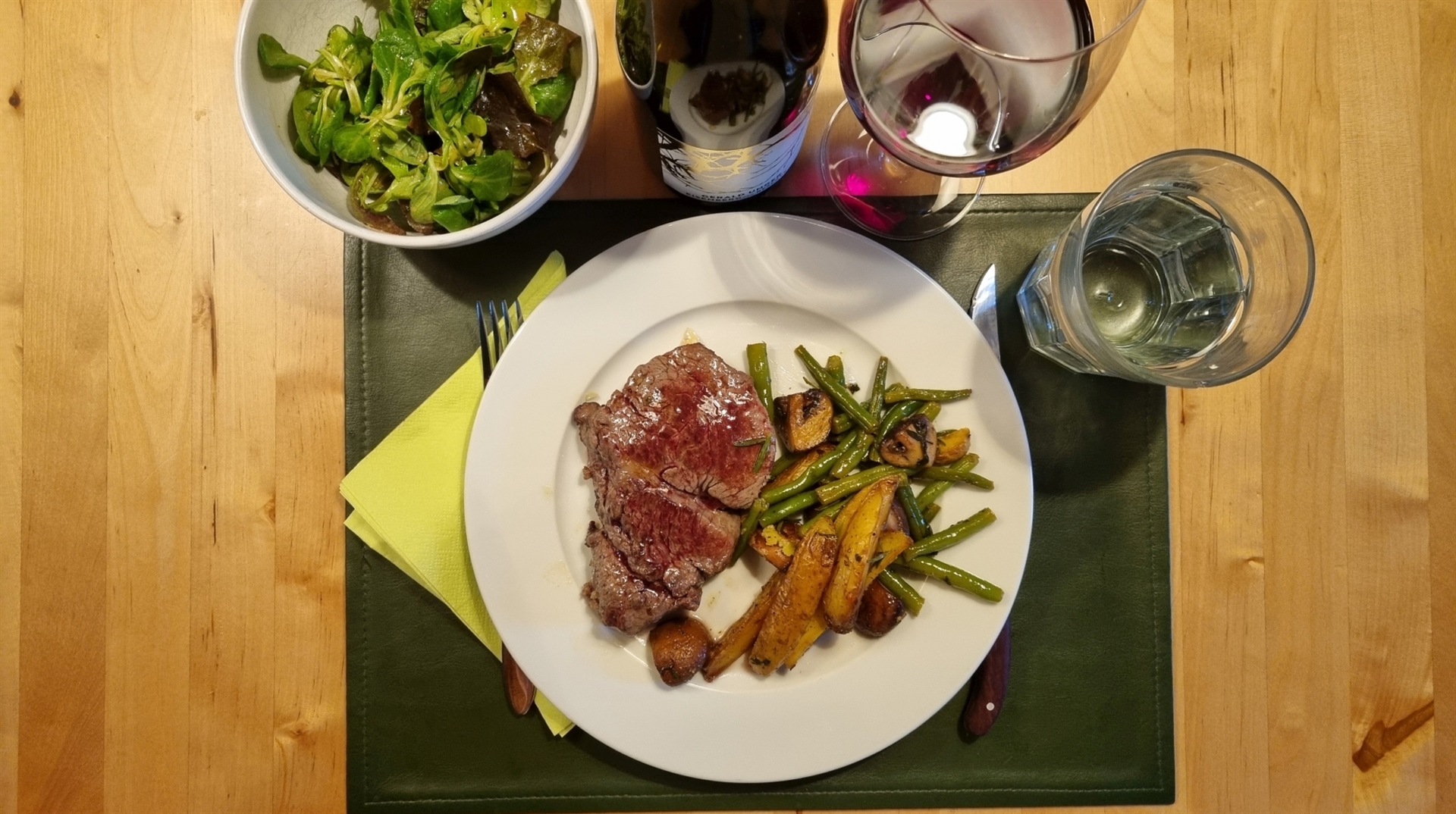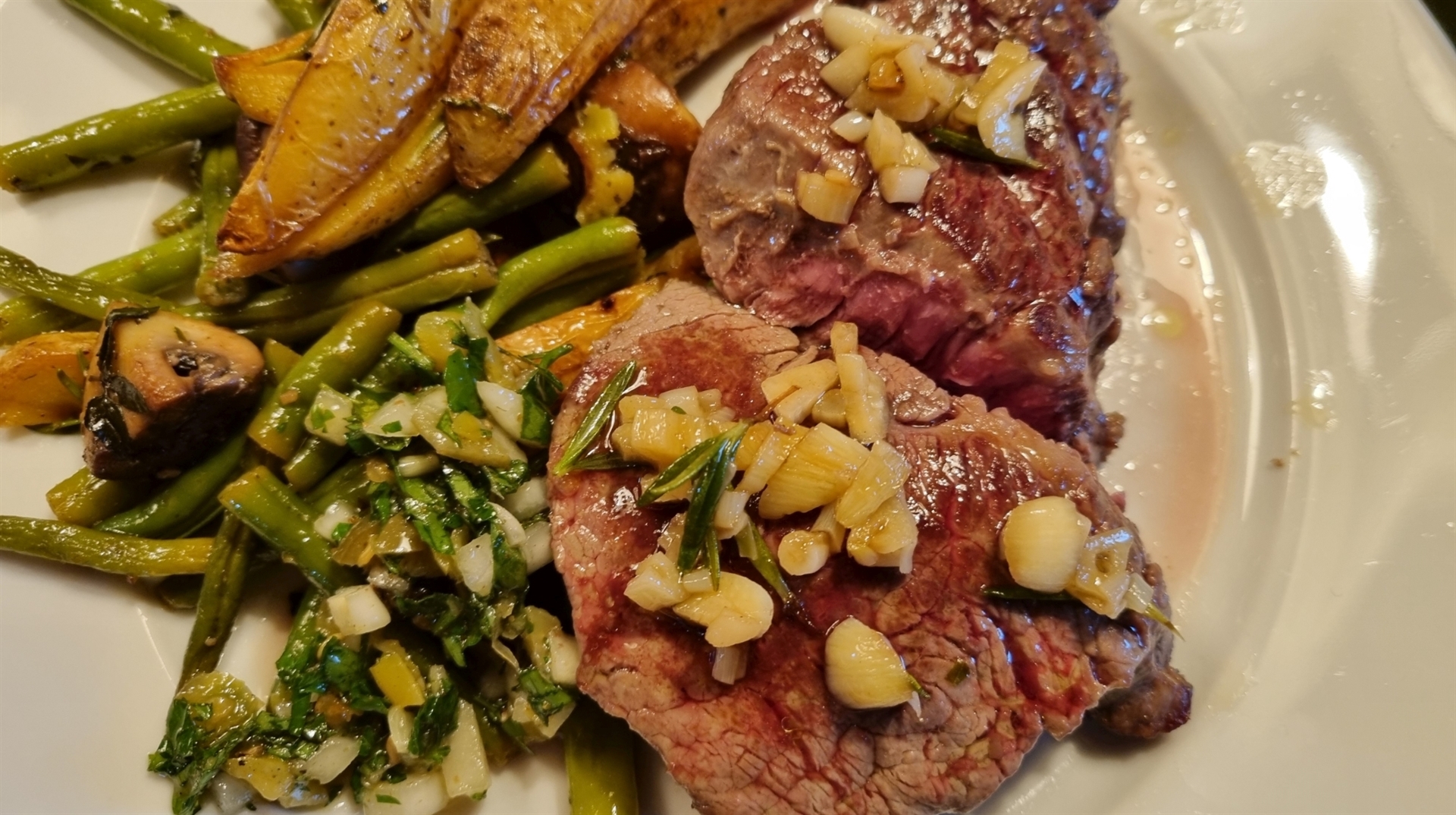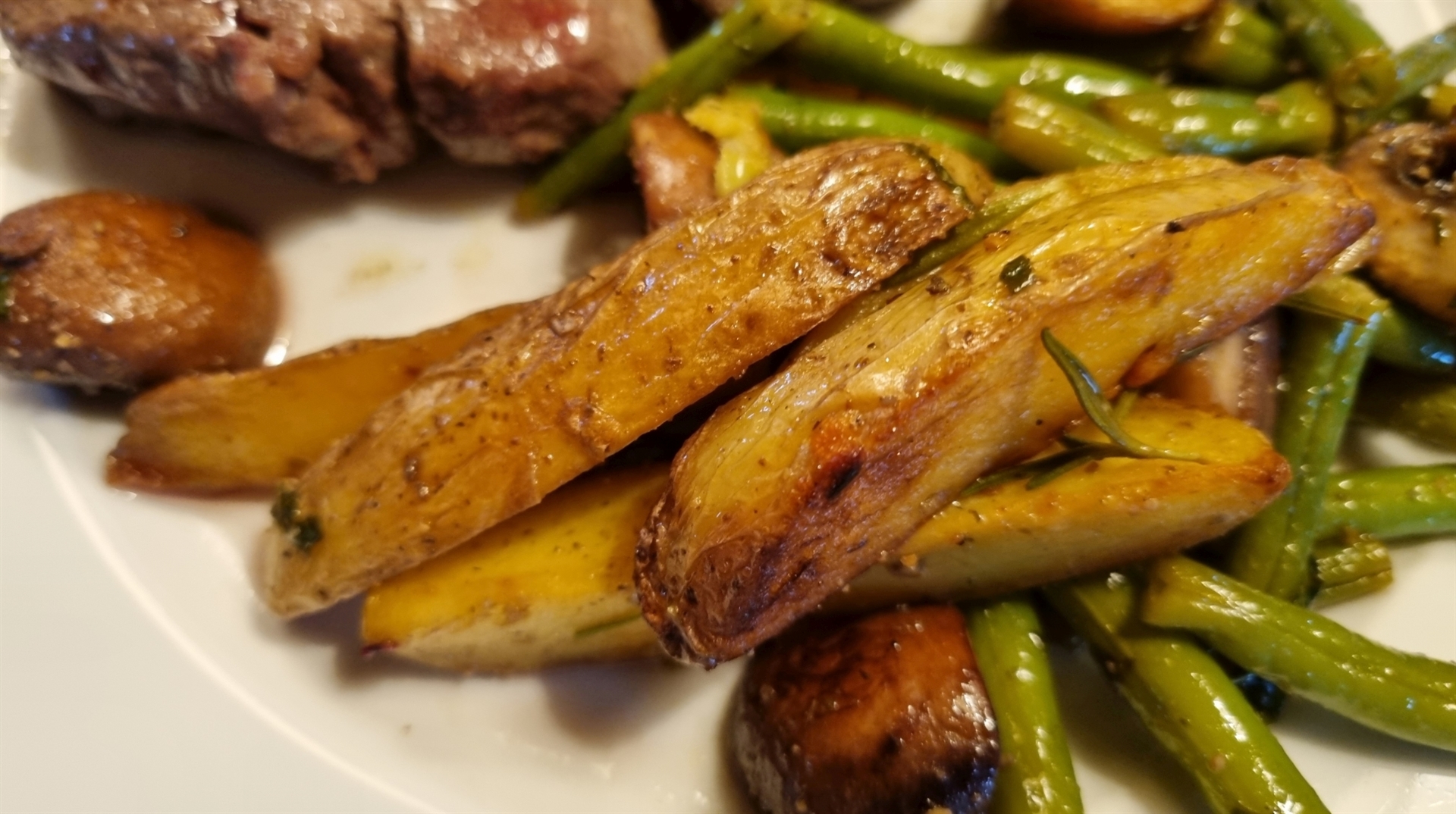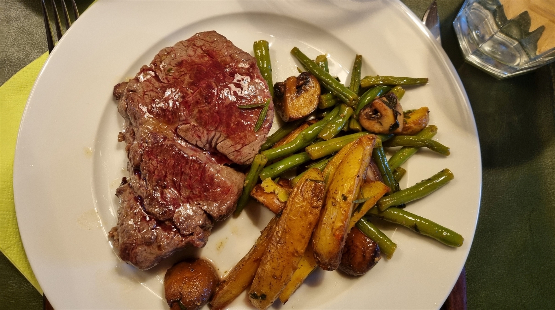 Rindslungenbraten mit Erdäpfel-Fisolen-Pilzen