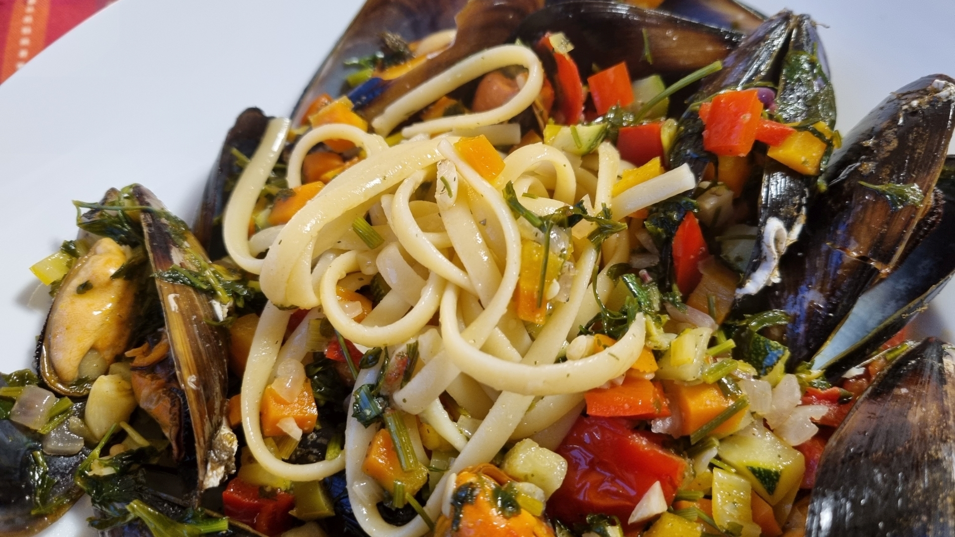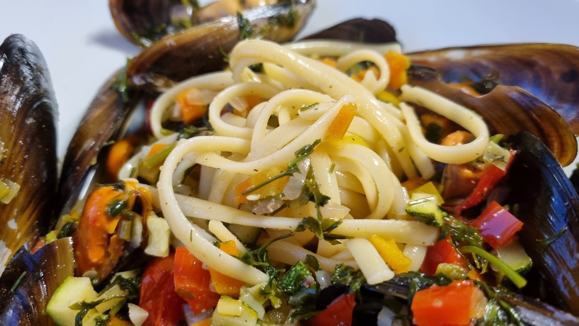 Für die Sauce einen großen Topf mit Olivenöl erhitzen. Petersilie, Schalotte und Gemüse einige Minuten braten. Sauce salzen und pfeffern. Die vorgekochten Muscheln mit dem Sugo und Knoblauch in die Sauce geben, zudecken und 5 bis 10 min bei mittlerer Hitze kochen. Linguine lt. Anleitung kochen. Die Nudeln 2 bis 3 Minuten vor der Zeit herausnehmen. Die Pasta zu den Muscheln geben und ein paar Minuten weiterkochen.