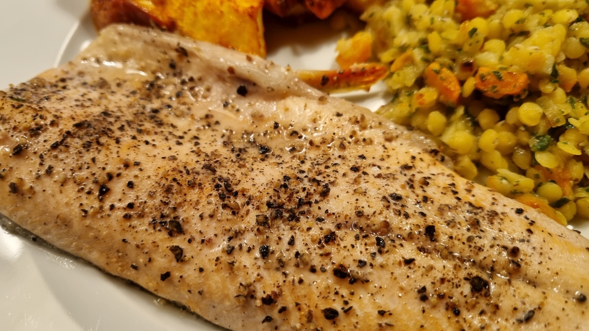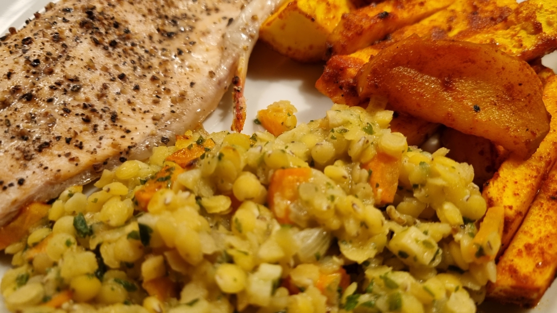 Saibling auf dem Salzstein - mit Kürbis-Linsen-Gemüse